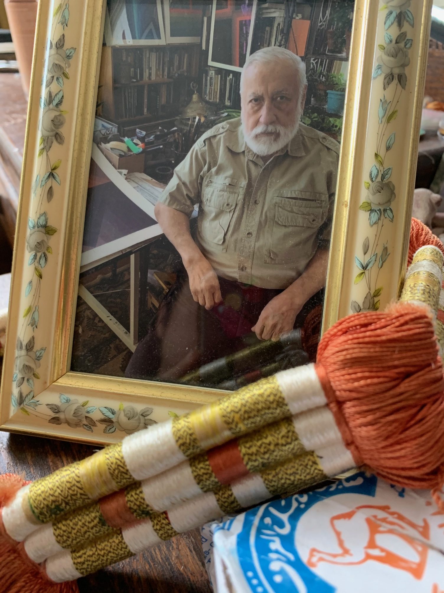 I wrap myself in my father’s keffiyeh. The picture on my altar frames him in front of his paintings and his prized tent heater, the crescent moon and star floating at its top. He filled that thing with god-knows-what paperwork and bits, never having needed to light it for warmth. I hugged him the last Christmas I saw him, as he cried for Palestine, and told him that I knew Palestine would be free. That I’ve seen change coming. I wish he could have seen it too, but he couldn’t wait to return to the land, hand in hand with his grandfather, so he left.